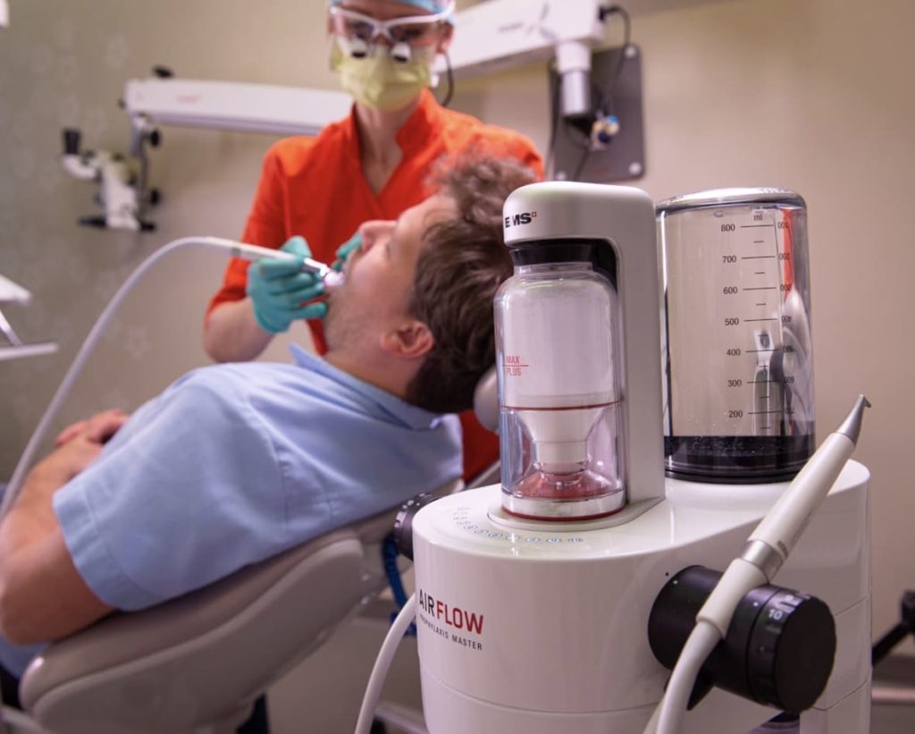 Zdravljenje se začne z natančnim diagnosticiranjem stanja v ustni votlini. Sledi odstranjevanje biofilma nad nivojem dlesni ali pod njimi s pomočjo tehnologije peskanja s prahom. Ta prah, ki temelji na eritritolu ali glicinu, nam zagotavlja ciljano, nežno, tveganjem prilagojeno odstranjevanje biofilma na podlagi začetne diagnoze.